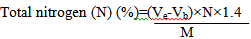 Where, Ve: volume of H2S04 required to titrate the sample solution (ml); Vb: volume of H2S04 needed titrate the blank (0 ml); M: weight of the test sample; N: normality of H2S04.