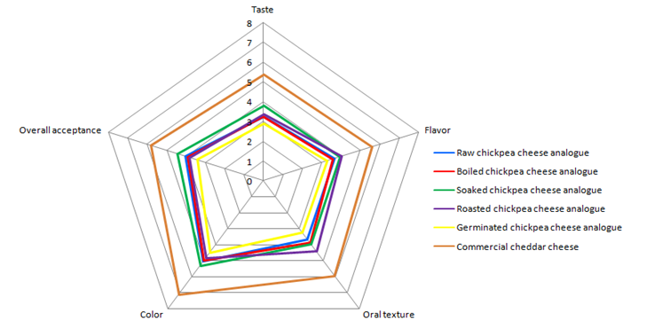 The scores for oral texture and flavor reflected that roasted chickpea cheese analogue was the most preferred compared to other chickpea cheese analogues with 4.39 and 4, respectively. Additionally, the soaked chickpea cheese analogue was rated highest among the other chickpea cheese analogues while in color and taste evaluation with 5.29 and 3.8, respectively. These findings are relatively low compared to those reported by Seleet et al. (2014) for spreadable processed cheese analogue supplemented with chickpea and Oyeyinka et al. (2019) for cheese analog from soy and cashew nut milk.