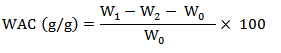 The method of Shen et al. (2021) was utilized to analyze WAC. A mass of 0.6 g of chickpea flour was measured (W0) and thoroughly combined with 10 ml of distilled water within a centrifuge tube (W2). The mixture was then subjected to centrifugation at 3,000 g for 30 min. The tube containing the chickpea flour was reweighed after removing the supernatant (W1). The WAC was calculated as: