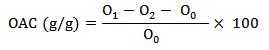 One g of accurately weighed chickpea flour (O0) was completely blended with 10 ml of corn oil in a centrifuge tube (O2). The mixture was kept at room temperature for 30 min and subsequently subjected to centrifugation at 3,000 g for 30 min. Afterward, the centrifuge tube was weighed after being inverted for 2 min to drain the supernatant and excess oil (O1). The OAC was calculated as:
