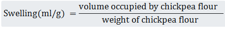 This parameter was defined in accordance with Benmeziane-Derradji et al. (2020); 10 ml of distilled water was added to 200 mg of chickpea flourin a graduated cylinder. The mixture was dispersed by moderate swirling and permitted to equilibrate at room temperature for 18 h. The swelling was calculated as follows: