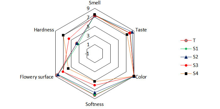 Camembert quality was evaluated by thirteen expert panelists comprising of an equal number of 15 men and 15 women, aged between 25 and 45. Each panelist received 10 g of camembert cheese samples, which were refrigerated and coded (T, S1, S2, S3, S4). Panelists were instructed to rinse their mouths with water between the evaluations of each sample to avoid flavor carryover. Camembert quality attributes including smell, taste, color, softness, flowery surface, and hardness were assessed using a nine-point hedonic scale, ranging from 1 (very dislike) to 9 (extremely like), after 12 days of ripening. Following the methodology outlined by Clark et al. (2009), panelists rated each attribute on this scale and the combined scores of all panelists were averaged to present a comprehensive evaluation of camembert quality over time.