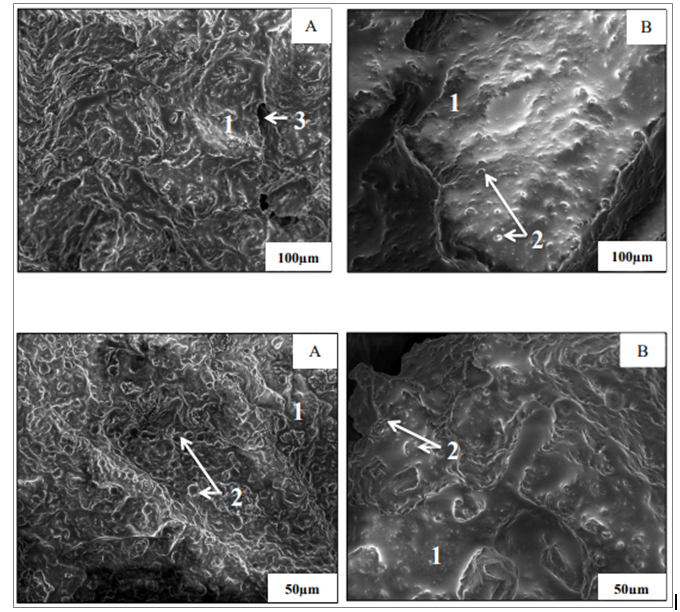 Figure 2: Scanning Electron Microscopy (SEM) of camembert cheese A (100% cow milk) and camembert cheese B (90% cow milk+10% buttermilk) after 12 days d of ripening