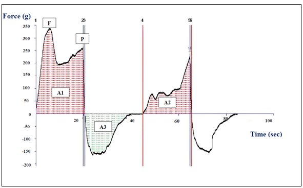 Figure 3: Texture profile Analysis (TPA) curve for camembert cheese made from 100% cow milk. The calculation of textural properties: P=Hardness (N); F=Fracturability (N); A2/A1=Cohesiveness; A3=Adhesiveness (g⋅s); Chewiness=hardness×cohesiveness×springiness (N)