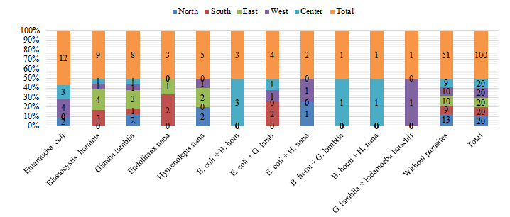 In the present study, the samples gathered from North of Yazd had lower contamination rate of E. coli, B. hominis, and E. nana. The vegetable samples gathered from East of Yazd showed higher contamination rate with B. hominis, G. lamblia, and H. nana. E. nana was only detected in samples gathered from the South of Yazd following by East samples. The prevalence of multiple parasitic contaminations of E. coli- B. hominis, B. hominis, G. lamblia, B. hominis, and H. nana was only detected in samples gathered from Central part of Yazd. E. coli- H. nana was found in samples gathered from North and West of Yazd. Such contaminations could be attributed to improper storage procedures, inadequate packaging, as well as the poor hygienic conditions of agricultural farms where the samples were prepared (Rodrigues et al., 2020). Furthermore, the agricultural practices of different locations and the environmental conditions could affect the type of parasitic contamination (Amoah et al., 2023).