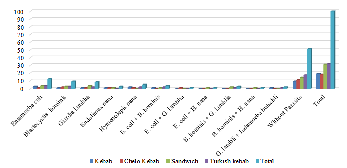 Regarding sandwich bars, the highest prevalence was reported by E. coli and G. lamblia (12.9%) followed by multiple parasitic contaminations of B. hominis, and G. lamblia. The differences in the type of parasitic prevalence in sandwich bars are related to type of used vegetables, improper handling, presence of dust, low quality of raw materials, cross-contamination, and storage conditions (Morales-Figueroa et al., 2021).