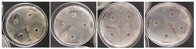 First, 100 ul of the fungal suspension was spread on pert dish containing Potato Dextrose Agar medium. A well was then created in the agar plate with a7mm borer and filled the well with EO solution in methanol (400 ul/ml) with 20ul in each well. Fluconazole was diluted in 100 ml distilled water and placed into wells (20 ul/well) and methanol solution, which served as positive and negative controls, respectively. Plates were then incubated at 25 oC for four days. The antibacterial activity was determined by measuring the fungal ZOI diameter in millimeters (Van et al., 2022).