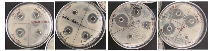 Two fungal strains Aspergillus niger and Candida albicans were tested to determine the antifungal activities of kinnow peel EO which was extracted by different methods. The bacterial strains were obtained from the Departments of Bio Nano Technology, Guru Jambheshwar University of Science and Technology, Hisar, Haryana, India. Active cultures were created by transferring a loopful of cells from stock cultures to flasks containing potato dextrose broth and incubated at 24 oC for 48 h.
