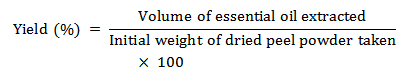 Conventional HD was performed using a Clevenger apparatus at 80 °C for five h. In a 1000 ml flask, 100 g of dried kinnow peel powder was dissolved in 700 ml of distilled water (Shaw et al., 2023; Yu et al., 2021). EO was stored at 4±0.2 °C. The yield was expressed as follows: