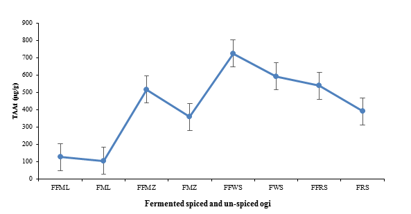 The TAAs of the formulated fermented ogi blends are documented in Figure 2. The results indicate that the formulated fermented ogi blends had significantly higher TAA than the controls samples. The highest and lowest TAA (µg/g) were recorded as 724.65 for formulated fermented white sorghum and 105.23 for fermented millet.