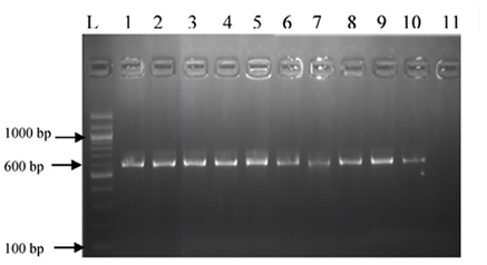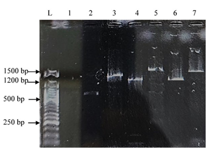 Figure 3: Polymerase Chain Reaction (PCR) product targeting the aflR gene in Aspergillus aflatoxiformans. L: 50 bp DNA Ladder; Lane 1: aflD gene; Lane 2: aflQ gene; Lane 3: aflM gene; Lane 4: aflP gene; Lane 5: aflR gene; Lane 6: aflO gene