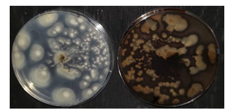 Figure 2: Qualitative screening of aflatoxin production in Aspergillus aflatoxiformans plates exposed to ammonia vapor (Left: beige control, Right: color change to plum red in isolate)