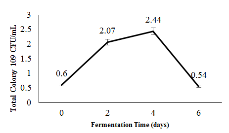 Microbial dynamics during fermentation were monitored using the TPC method, with samples collected on days 0, 2, 4, and 6. As shown in Figure 1, the initial TPC was 0.6×109 CFU/ml on day 0, increasing sharply to 2.07×109 CFU/ml on day 2 and peaking at 2.44×109 CFU/ml on day 4, before declining to 0.54×109 CFU/ml on day 6—likely due to nutrient depletion, accumulation of toxic metabolites, or the onset of the death phase (Tamang et al., 2016).