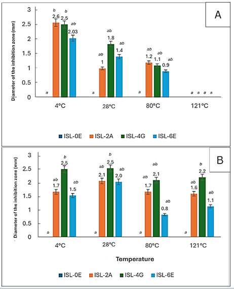 substances against E. coli decreased with increasing temperature. At 4 °C, ISL-2A and ISL-4G exhibited the highest activity, significantly greater than ISL-0E, while ISL-6E showed moderate but comparable inhibition. At 28 °C, inhibition zones of ISL-2A, ISL-4G, and ISL-6E decreased but remained higher than ISL-0E. Activity persisted at 80 °C (0.9–1.2 mm zones) but was completely lost at 121 °C, likely due to bacteriocin.