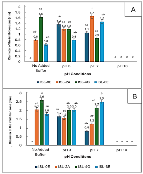 Similarly, against S. aureus (Figure 5B), the highest activity occurred at pH 7, particularly for ISL-4G and ISL-6E. In contrast, at pH 10, inhibition was minimal or absent, likely due to denaturation of bacteriocin-like substances under strong alkaline conditions, confirming that neutral to slightly acidic pH favors bacteriocin stability and activity (Malik et al., 2016).